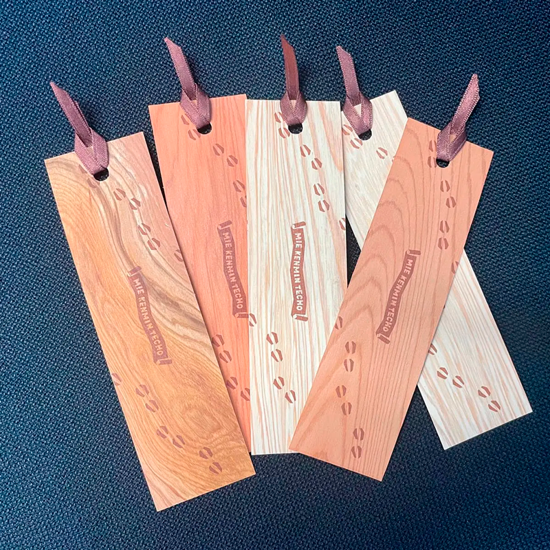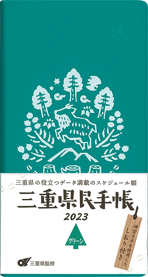 自然との共生やSDGsの観点から三重の森や木を企画の中心に据えたこの年の手帳は三重県の木である「神宮スギ」の栞を付録として封入しました。本物の神宮スギを薄くスライスし、和紙と貼り合わせた栞は一枚一枚が全て微妙に違い、同じものは1つもないオンリーワンの貴重な栞となりました。カバーは塩化ビニール(エコの観点から、製造で生じる廃棄する端材を再利用)に坪井健さんが三重の動物「カモシカ」に森を絡めたポップなデザインのカバーに仕上げていただきました。