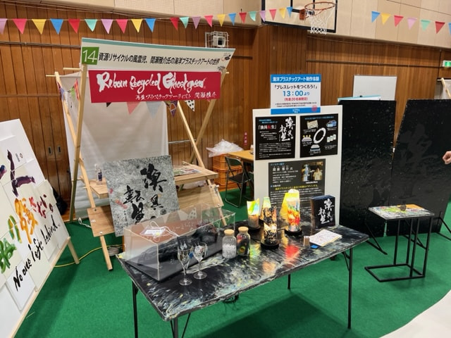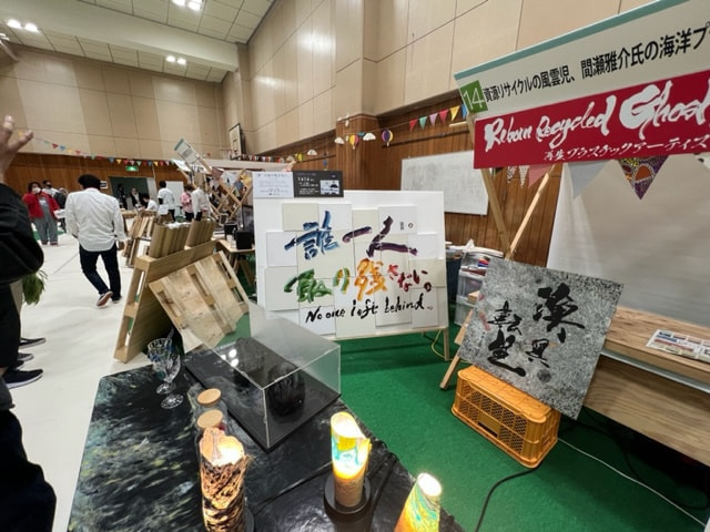 三重チームは間瀬雅介さんの海洋プラスティックリサイクルの活動とアート作品の良さを、より多くの方々に知らせる為に、書道家の千華万香さんとのコラボレーションによる間瀬さんの活動のブランディング化を行いました。「漁具転生」はその中で生まれた造語です。